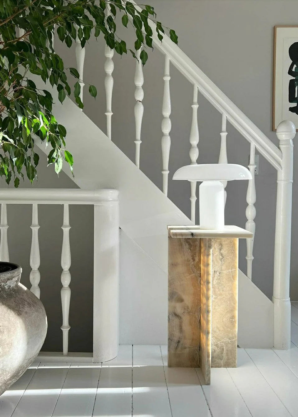 Denne pidestallen er laget av Alvera, en vakker, gyllen onyx fra Europa. Når solens stråler trenger gjennom steinen, kommer detaljer og viltvoksende mønstre til syne og får steinen til å lyse. På grunn av Alvera-steinens naturlige og vakre uttrykk og variasjoner vil hvert bord fremstå som helt unikt.